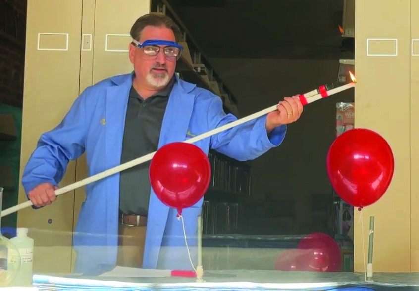 Dr. Schroeder illustrates the difference in combustibility between helium and hydrogen.