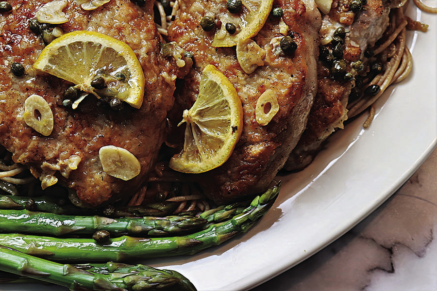 No fresh lemons? Bottled lemon juice works just fine, especially when lemons are out of season. No white wine? Simply use more chicken broth. And for a lighter version, you can easily substitute chicken breast for the pork. EASY PORK PICCATA Yield: 4 servings Total Time: 40 minutes 4 boneless pork chops (about 1 1/2 pounds, 1 inch thick) Zest and juice of 1 large lemon (or 3 tbsp lemon juice, divided) 1/2 cup all-purpose flour 1/2 teaspoon kosher salt 1/4 teaspoon black pepper 4 tablespoons butter, divided Splash of olive oil 2-3 cloves garlic, thinly sliced 1/4 cup dry white wine 1/2 cup chicken broth 1 tablespoon capers Place each pork chop between two pieces of wax paper or in a large zip-top plastic bag. Use a meat mallet or rolling pin to gently pound the chops to about 1/2 inch thick. This helps to tenderize the meat, allowing it to cook quickly and evenly.