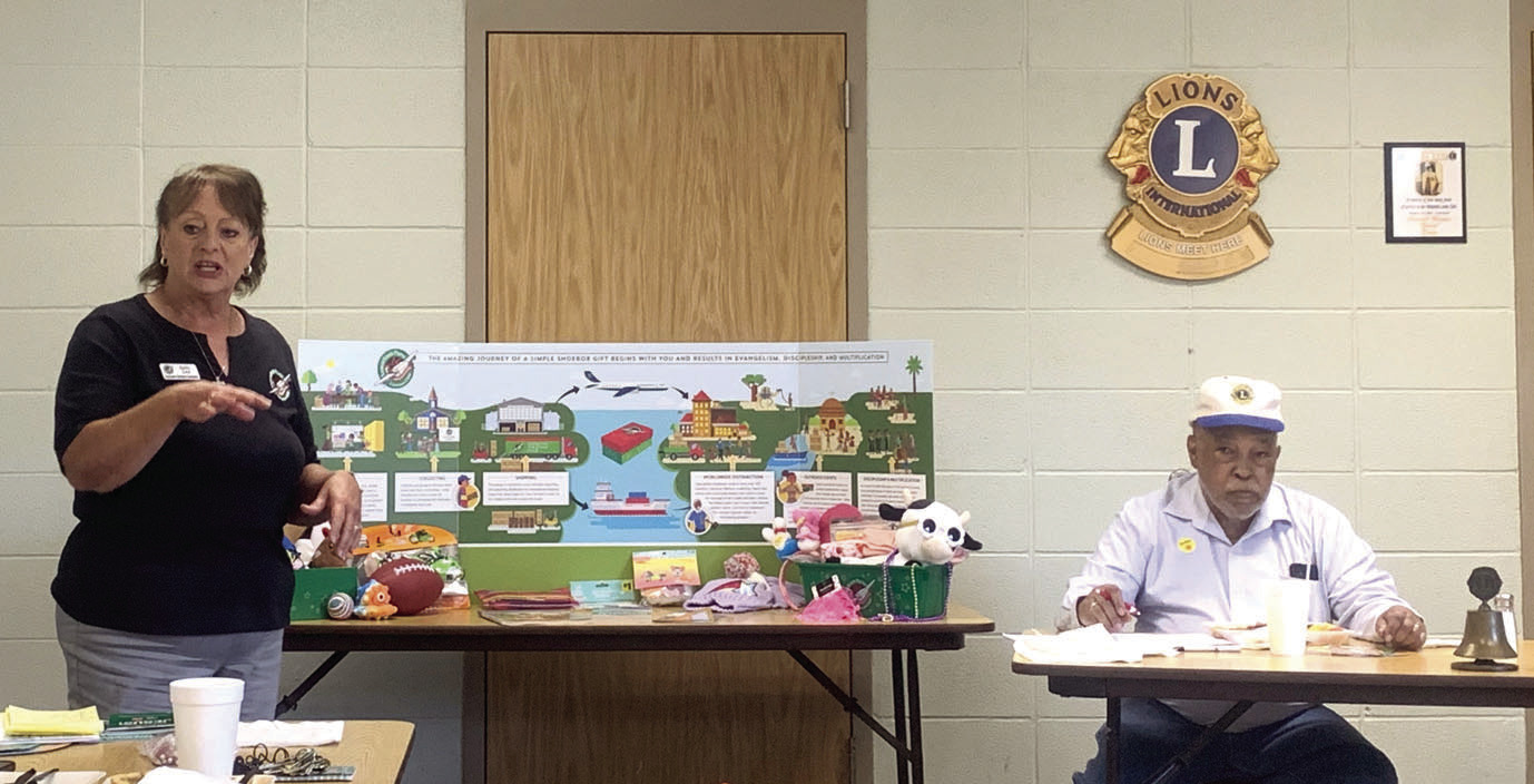 The Hampton Lions Club met Tuesday, October 21 for their regular monthly meeting. Kathy Love, Community Relations Coordinator and a yearround volunteer for Operation Christmas Child was the guest speaker. Mrs. Love spoke about the Samaritan's Purse project, Operation Christmas Child, and the impact that this outreach project has on millions of children each year. Also in attendance was Sonya Harrell, Church Relations Team Member and a year-round volunteer for Operation Christmas Child (OCC). If you would like any information about packing shoeboxes with your family, church, organization, individually, or business, please reach out to Mrs. Harrell at 870-510-4773.
