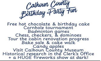 Calhoun County, established on December 6, 1850, officially turns 175 years old this Saturday! This Saturday on the Courthouse Square in Hampton, we will celebrate the county’s 175th birthday with historic games and community fun. Starting at 2pm, everyone is invited to come downtown to join us for a celebration.