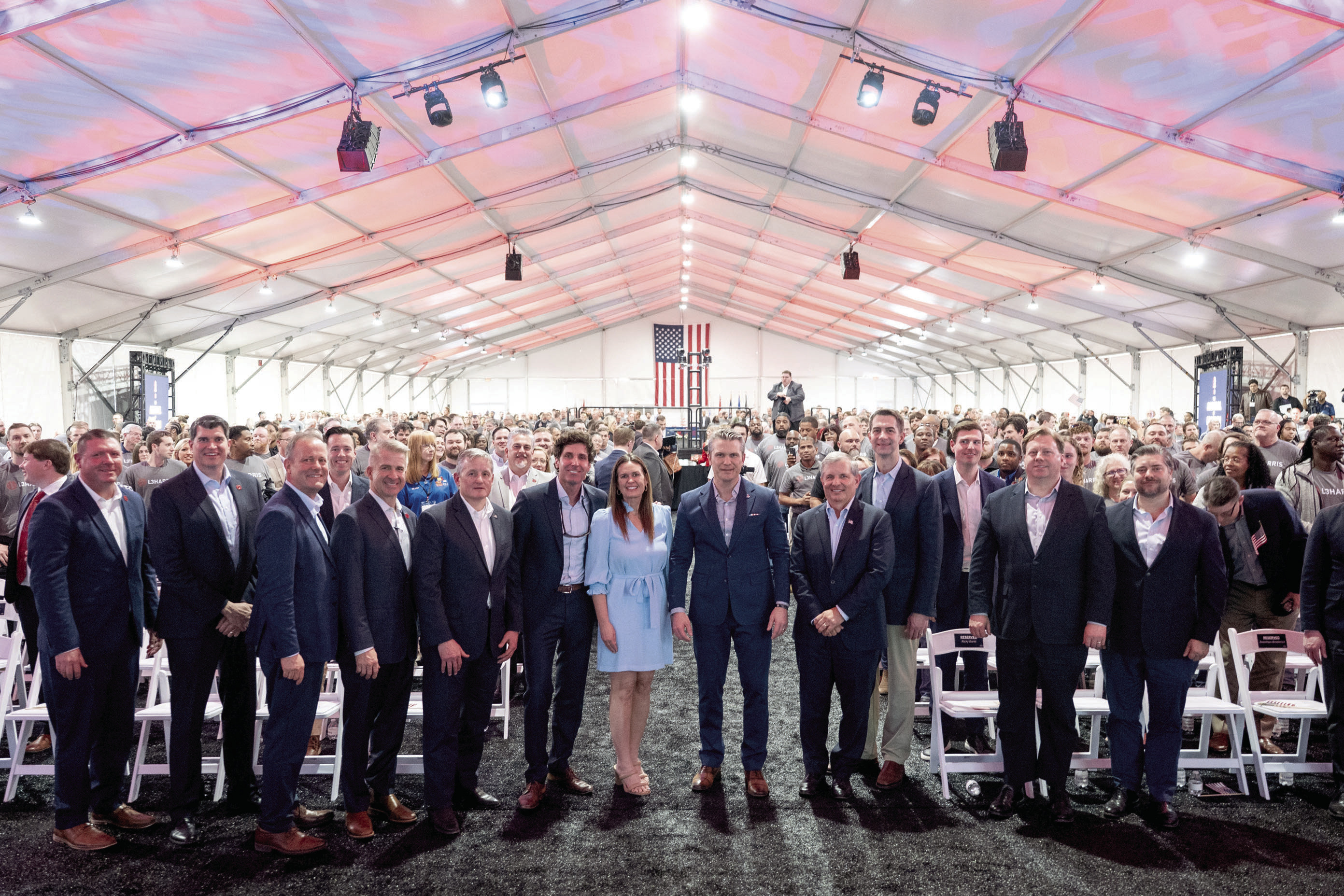 Governor Sarah Huckabee Sanders and First Gentleman Bryan Sanders with U.S. Secretary of War Pete Hegseth, U.S. Representative Bruce Westerman (AR-04), U.S. Senator Tom Cotton (R-AR), L3Harris CEO Christopher Kubasik and L3Harris CFO & President Ken Bedingfield, and L3Harris President of Missile Solutions Scott Alexander, and other L3Harris executives and employees in Camden on Friday, February 27. Photo credit: Will Newton.